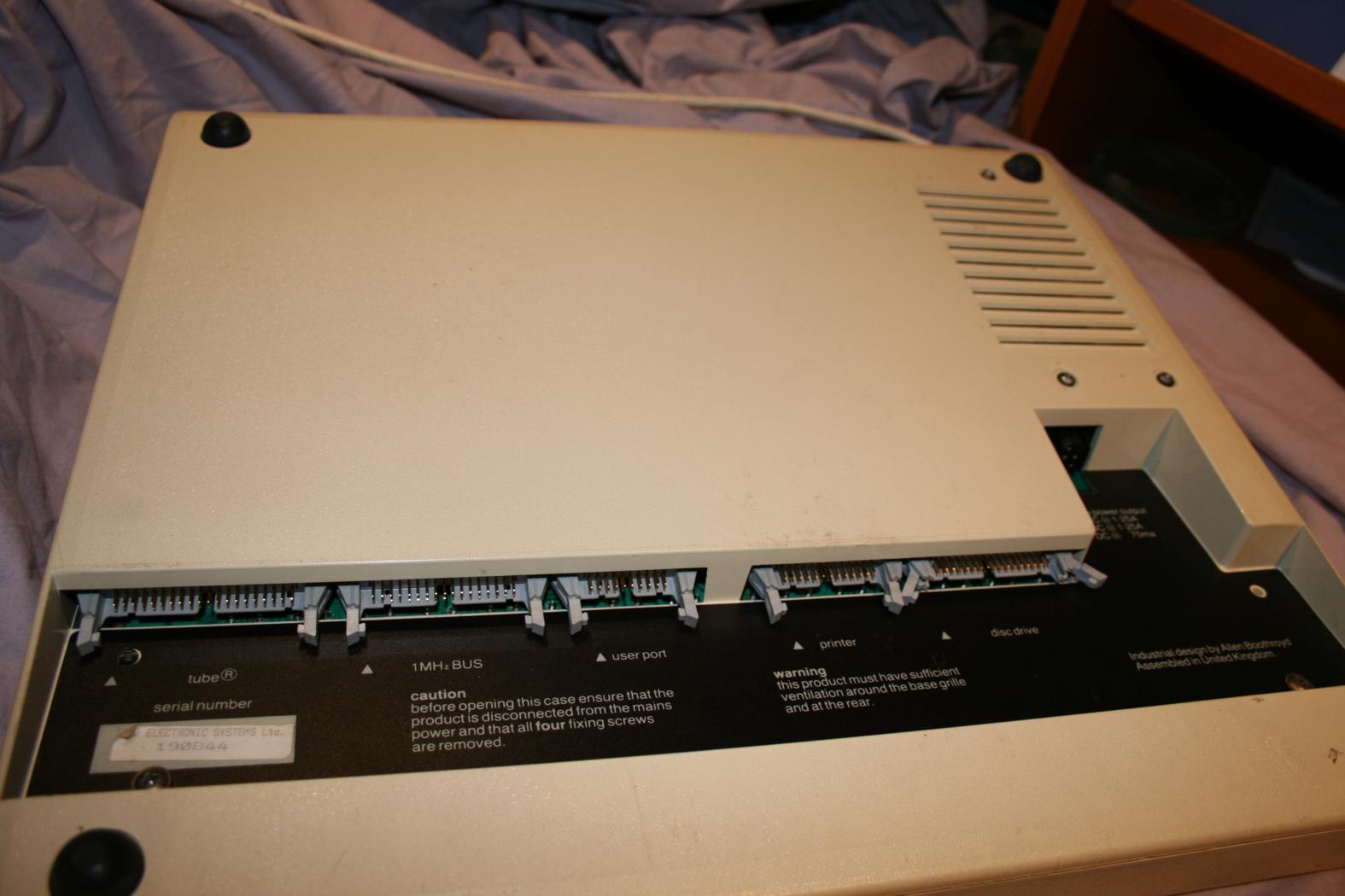 The beeb was famous for its array of expansion options, including the ability to add a second processor (and not just another 6502 – a Z80 was an option amongst others).  This is available via the ‘Tube’ connector.  On the far right, partially obscured, is a black connector for auxiliary power, in this case I use it to power the disc drive.